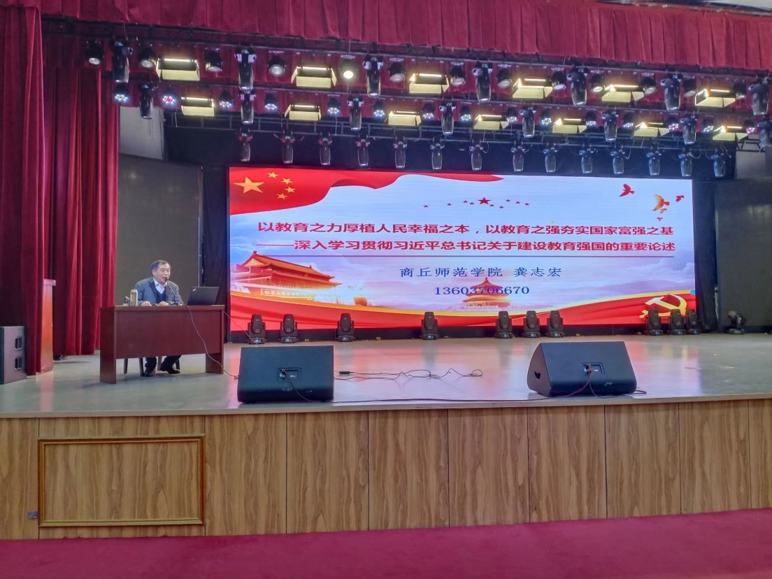 2023年12月6日下午,龚志宏教授在我校睢阳校区大礼堂进行了《以教育之力厚植人民幸福之本,以教育之强夯实国家富强之基——深入学习贯彻习近平总书记关于建设教育强国的重要论述》专题讲座,“省培(2023)”——万名优秀中青年教师培育小学语文班全体学员聆听了讲座。