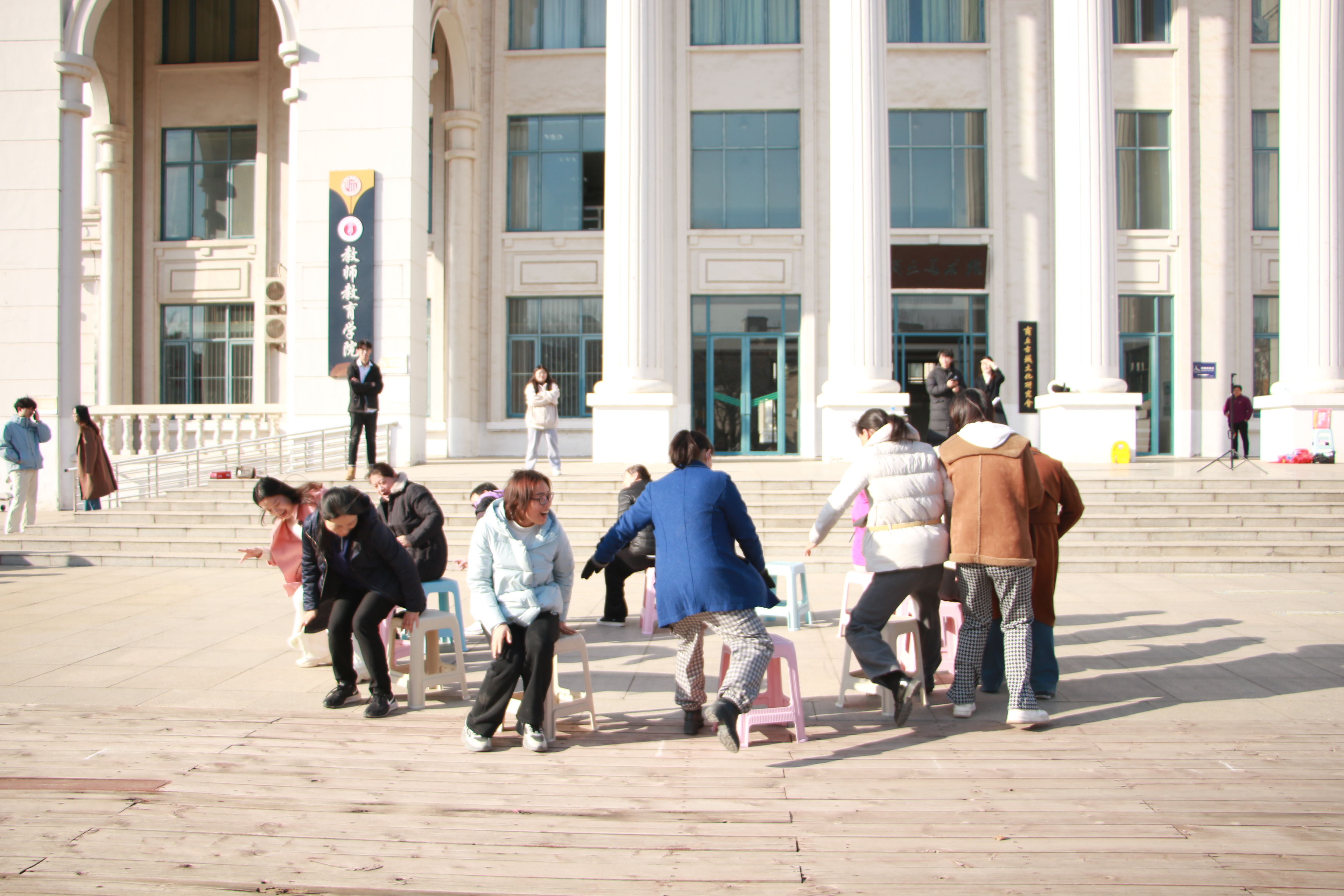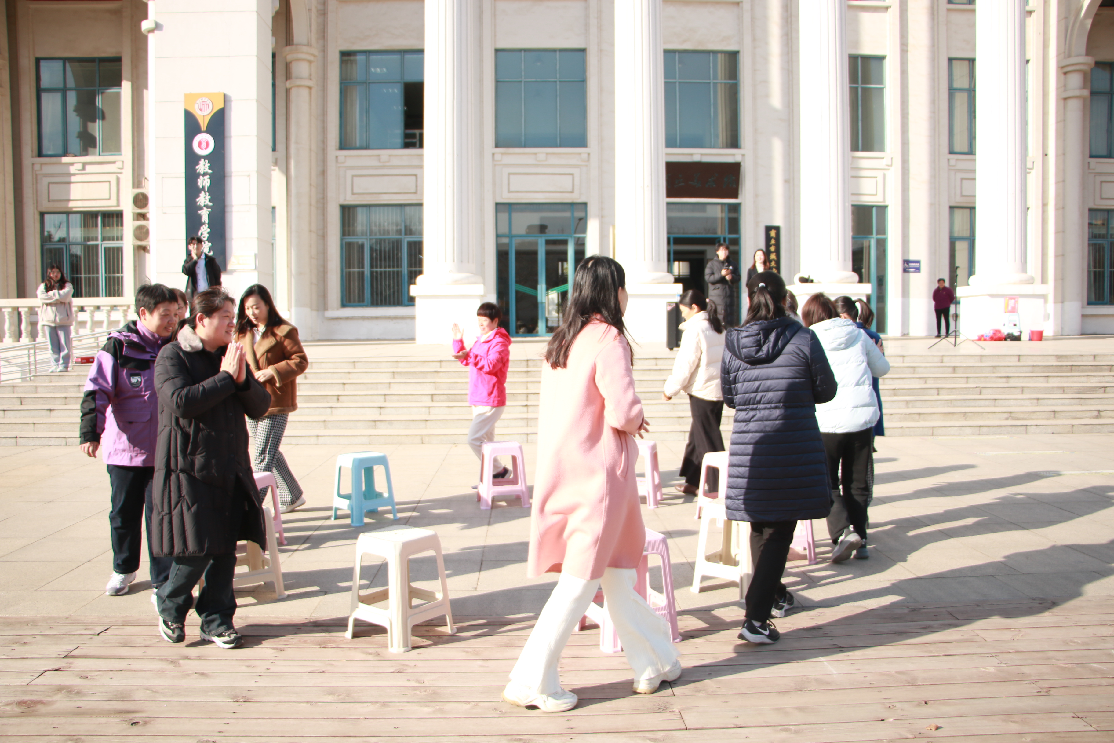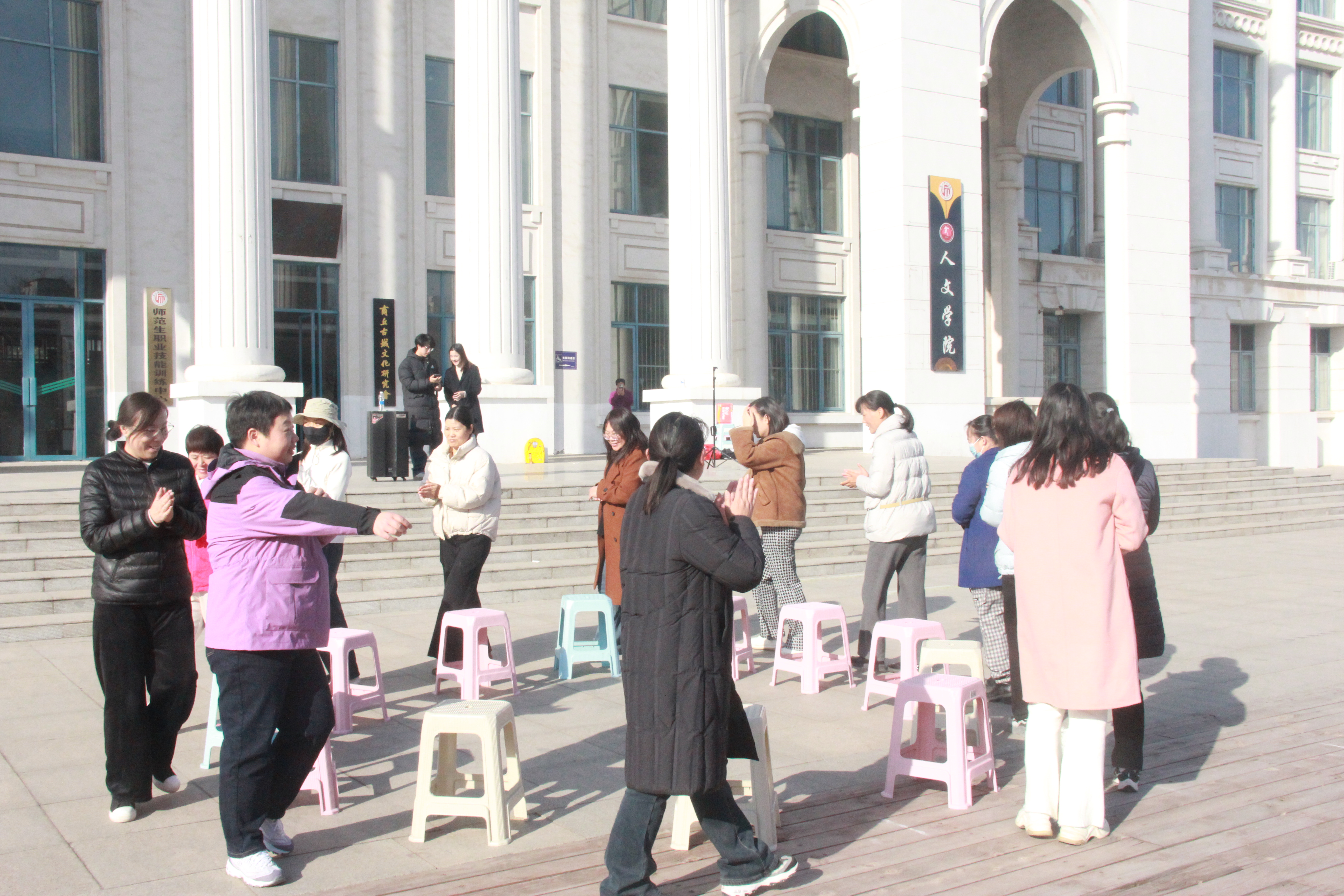 在第二环节的抢凳子游戏中,教师们认真把握音乐节奏,不断调整走位,全身心地投入游戏中去,场上欢笑阵阵,气氛融融。