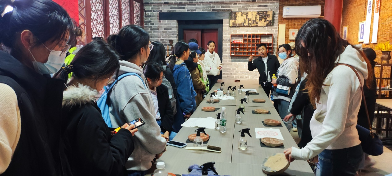 在陈家大院,归德魏木版年画第四代传承人魏威威,详细介绍并展示了古法造纸、雕版印刷、传拓、陶瓷拉坯等工艺操作和实际应用,同学们领略到了中华优秀传统文化的博大精深。