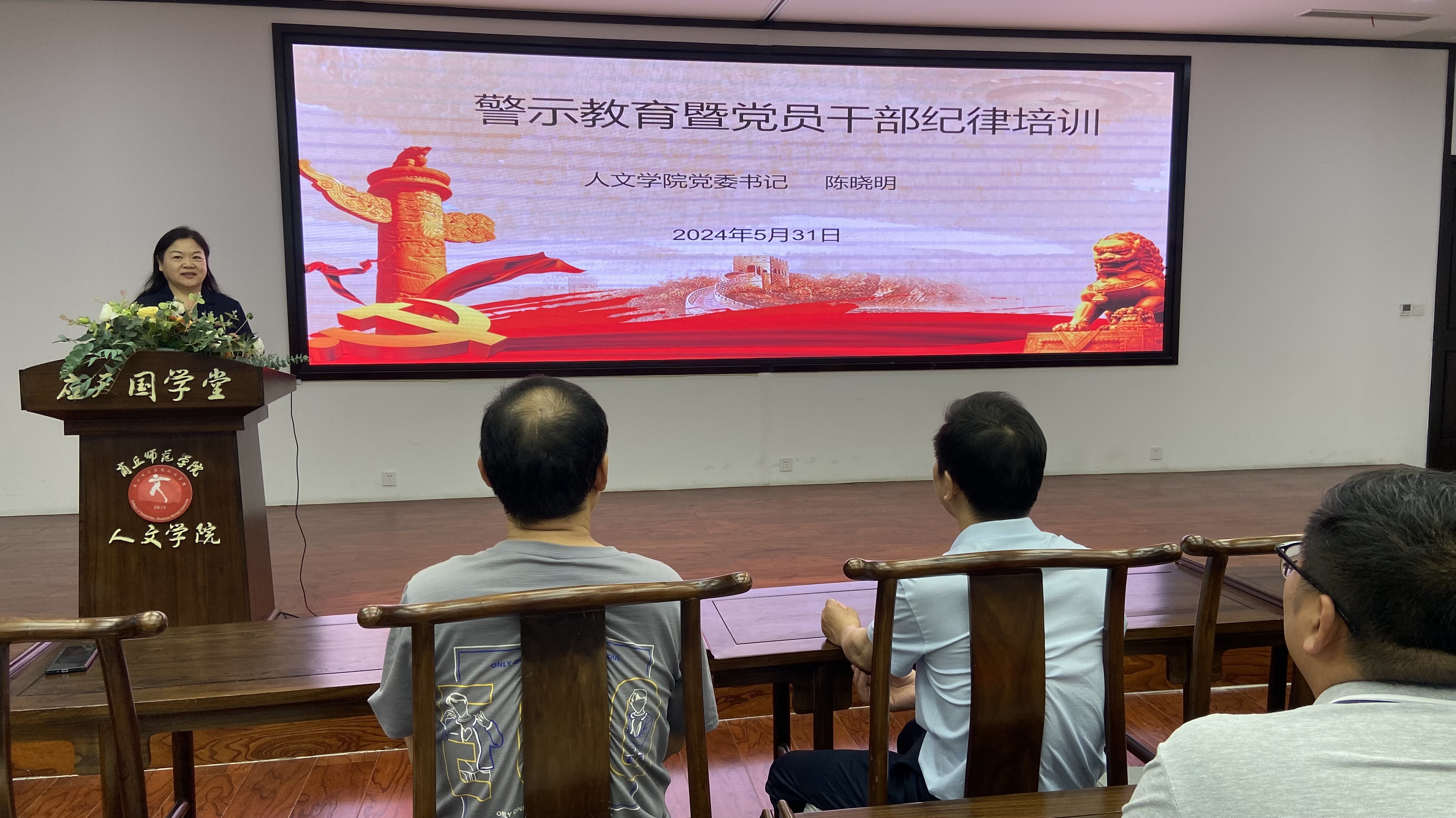 5月31日下午,国产欧美一区二区在汉梁楼国学堂开展党纪警示教育暨党员干部纪律培训会。学院党委书记陈晓明、各党支部书记和教职工党员参加会议。