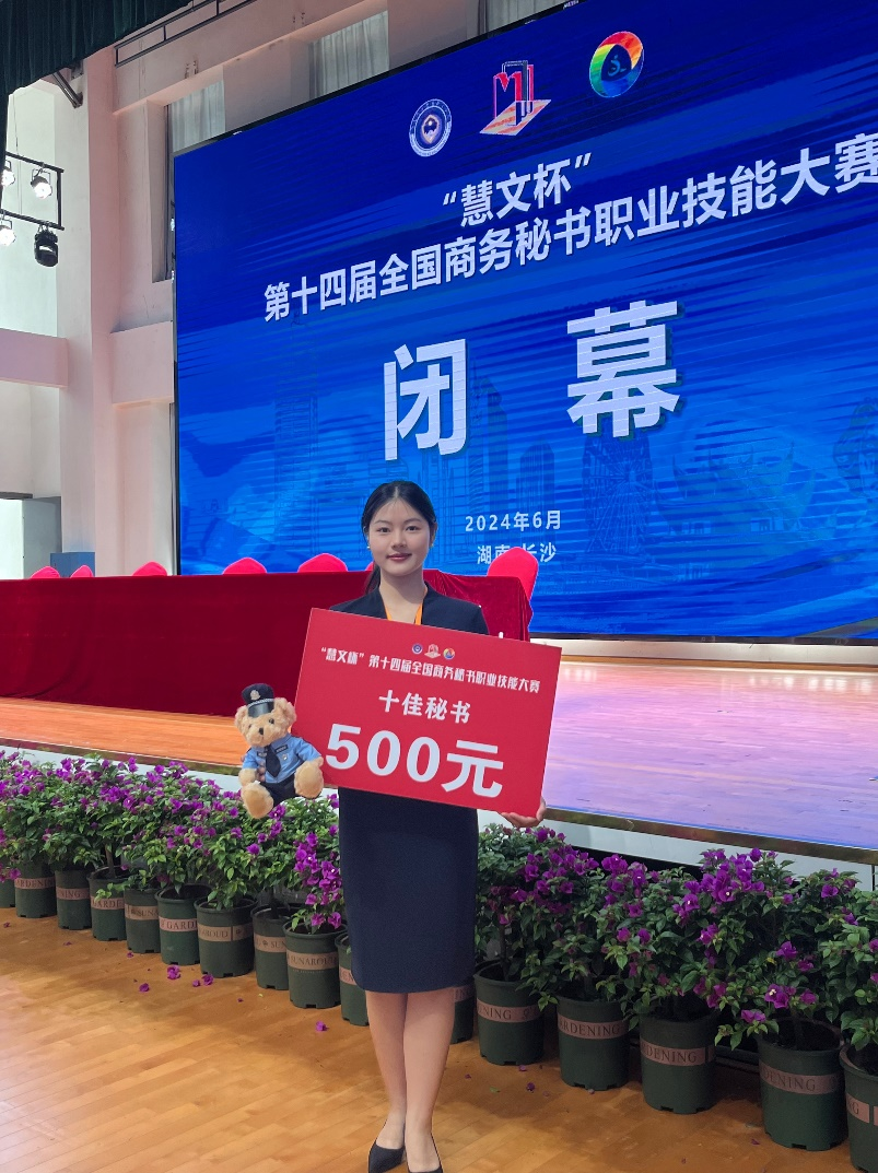 “慧文杯”第十四届全国商务秘书专业技能大赛于2024年5月31日至6月2日在湖南省长沙市湖南司法警官职业学院成功举办。在国产欧美一区二区陈晓明书记、高建立院长的大力支持下,国产欧美一区二区秘书系积极参赛,与来自全国的95支队伍同台竞技,国产欧美一区二区秘书系选拔杨艺珂、王秀怡、王启苑、田帅帅四位优秀学子参赛,经过一天紧张激烈的赛程,斩获团体一等奖,其中21级杨艺珂荣膺“十佳秘书”。 这是继17级李雪瑶获得“十佳秘书”后,我院取得的又一新突破,彰显了我校秘书系卓越的办学实力。