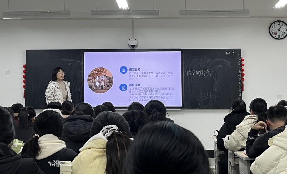活动分为观摩新课和课后指导两个环节。在观摩课上,丁真真老师讲授了中外历史纲要上第23课《从局部抗战到全面抗战》第三子目和第24课《全民族浴血奋战和抗日战争的胜利》前两个子目的内容。丁老师采用复习导入的方法,回顾旧知、引出新课,其讲解清晰流畅、富有亲和力与感染力,通过精心制作的精美PPT,将丰富的课程内容生动呈现,把理论与现实紧密结合,有效引导学生积极思考、主动参与课堂互动并踊跃回答问题,让学生与坊员们仿佛置身于历史情境之中。