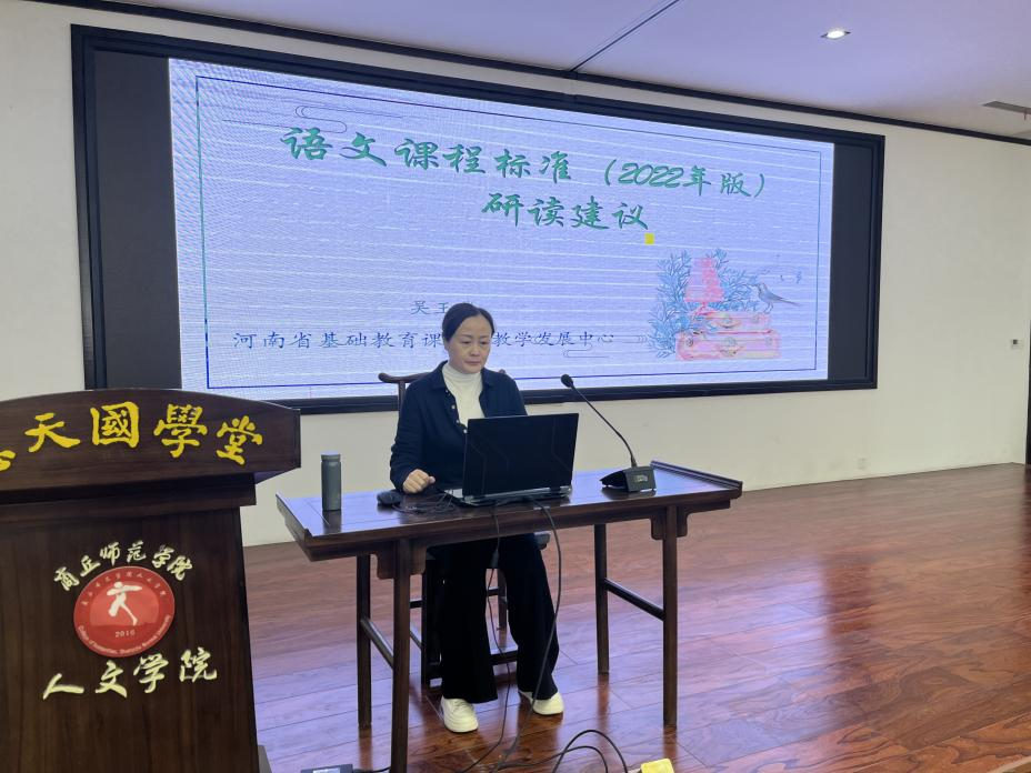 2025年3月16日,河南省基础教育课程与发展中心教师发展研究部副主任、小学语文特级教师吴玉华在(2024)“万名优秀中青年教师培育计划”小学语文教师培训中,开展《语文课程标准(2022年版)研读建议》为主题专题讲座。吴玉华老师作为全国教学竞赛一等奖得主、国家基础教育教学成果奖获得者,结合自身教研经验,从课标结构框架、核心素养内涵、学段目标衔接及教学实践转化等方面,为参训教师提供了系统化指导。