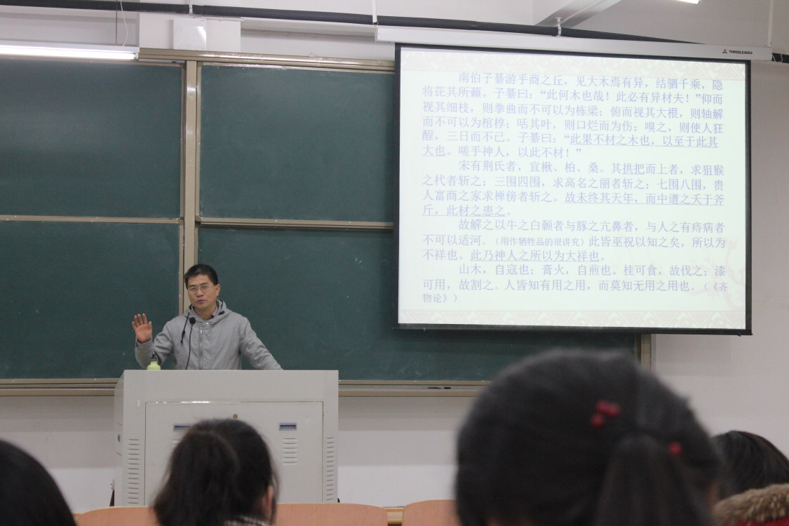 3月12日晚,刘洪生教授在我校平原路校区实验组团楼125教室开展题为“庄子思想的当代价值”的讲座。讲座课题十分具有现实意义,吸引众多老师和同学前来倾听。