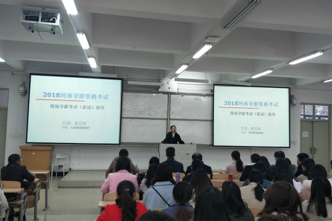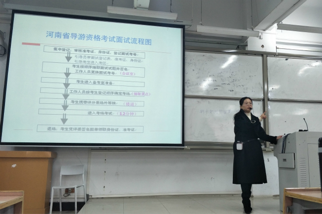 张昌亚老师结合自身经验,详细介绍了导游资格证考试流程和评分标准。随后,张老师以少林寺、龙门石窟这两个景点为例,从专业的角度示范如何进行导游词整理和景点讲解,展示了扎实的专业功底和良好的职业素养。最后,张老师就如何回答面试中的问题和面试礼仪、技巧等进行了系统全面的讲解,赢得在场师生阵阵掌声。大家纷纷被张老师的专业素养和敬业精神所折服。