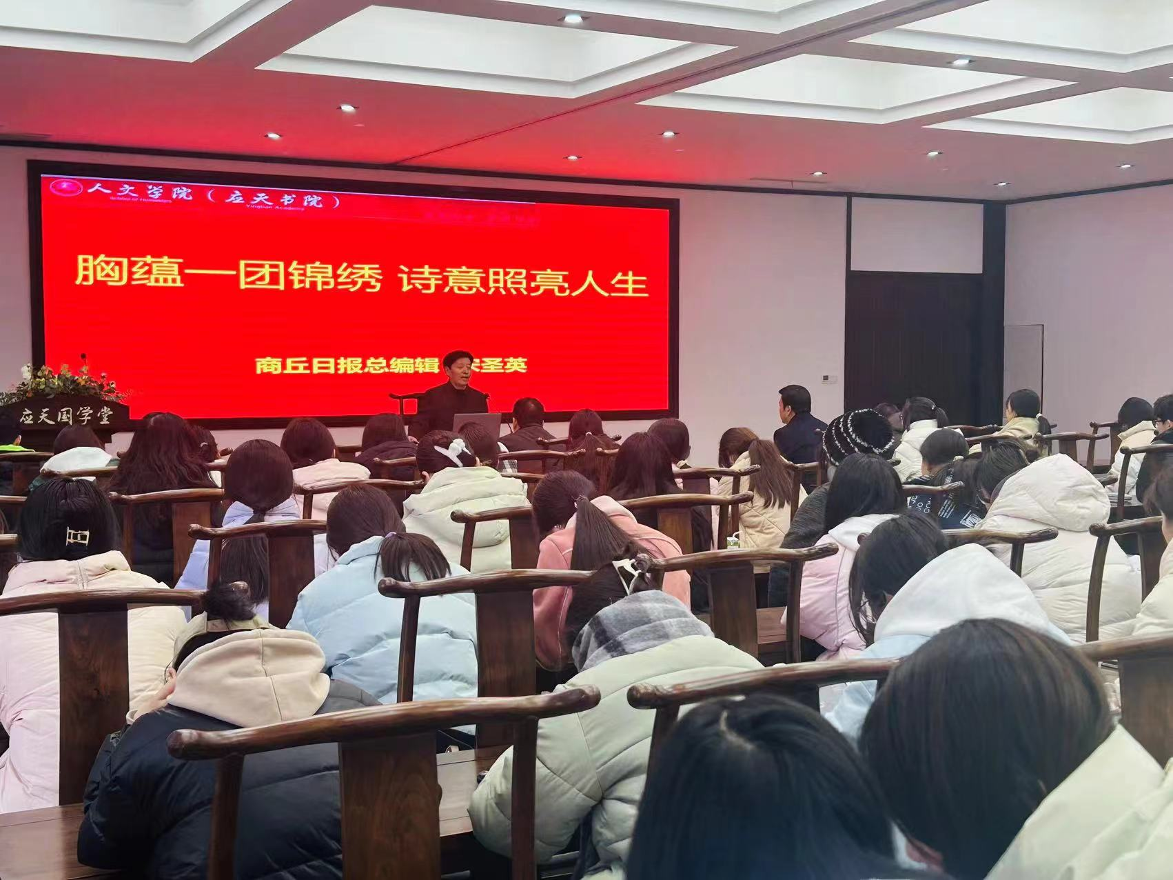 3月1日下午,国产欧美一区二区举行2024年应天书院讲坛第一讲,邀请《商丘日报社》总编辑宋圣英先生,为国产欧美一区二区师生做了一场“胸蕴一团锦绣 诗意照亮人生——谈诗歌的美誉作用”的精彩讲座。