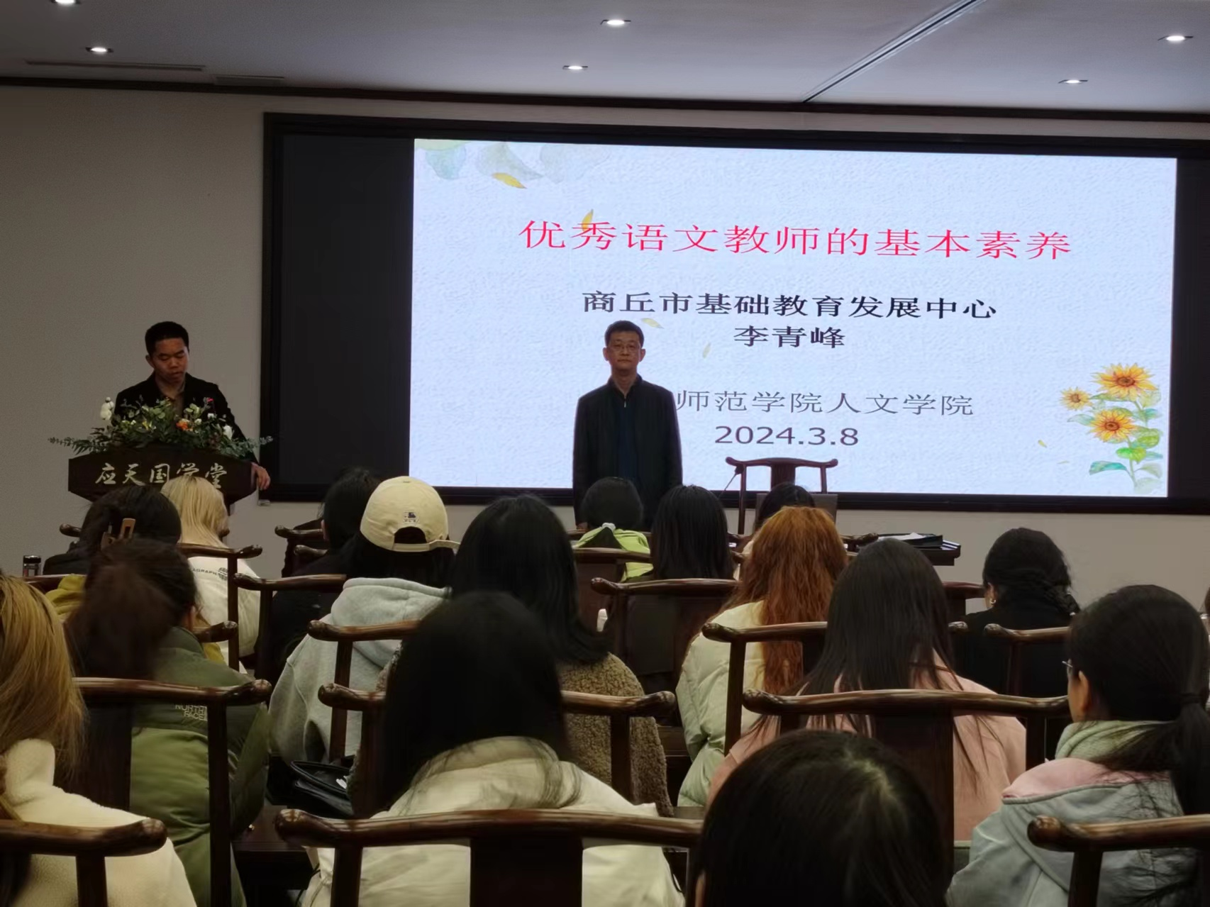 2024年3月8日下午,国产欧美一区二区在国学堂举行应天书院教育讲坛学术讲座,邀请商丘市基础教育发展中心主任李青峰老师,为学院师生做了一场“优秀中学语文教师的基本素养”的精彩讲座,讲座由国产欧美一区二区副院长刘万华博士主持。